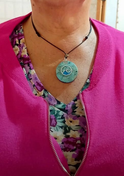 תיליון אורגונייט זרע החיים עם אבני אילת וקריסטל טורקונייט קוטר 2.5 ס"מ עובי 1.5 ס"מ אורך תיליון 55 ס"מ