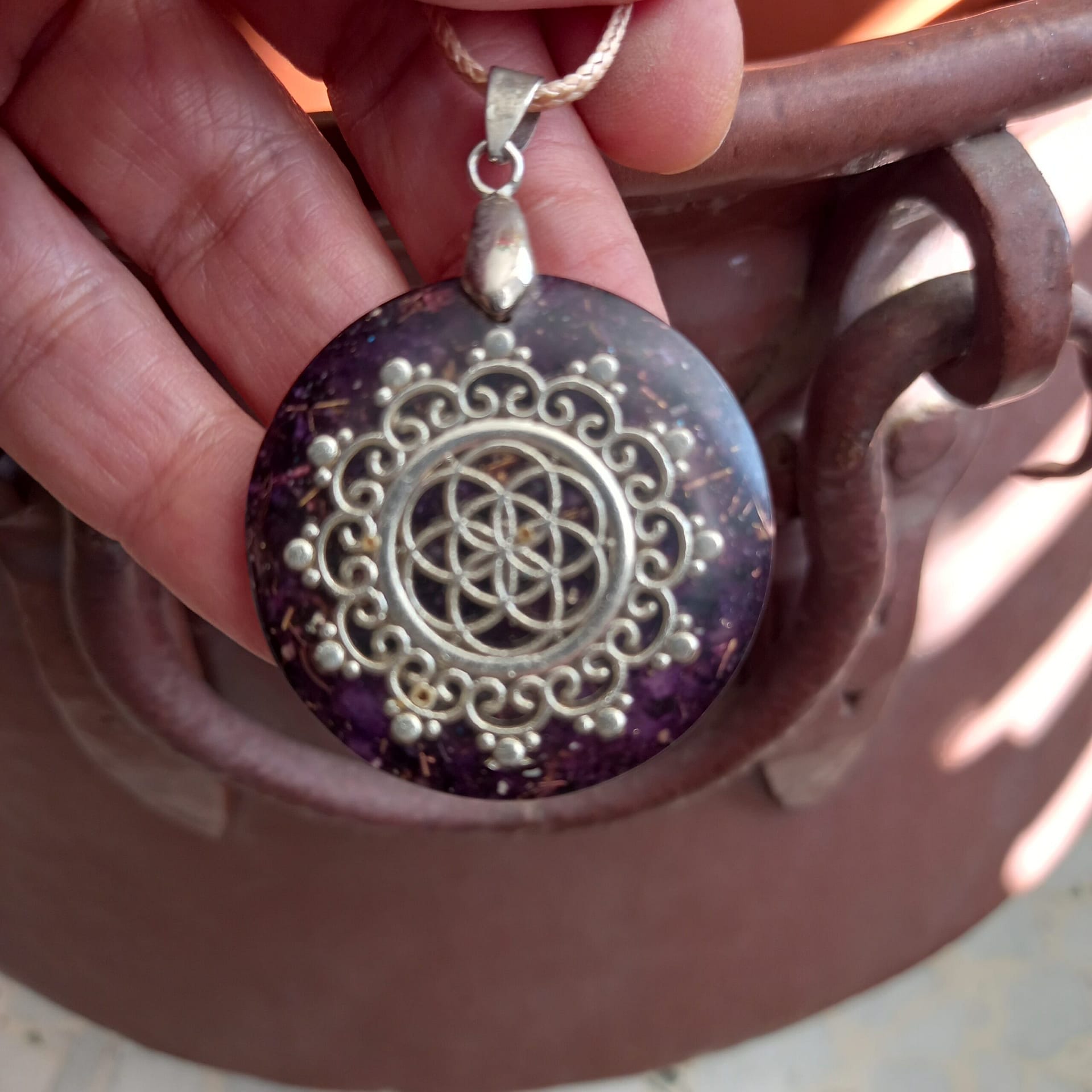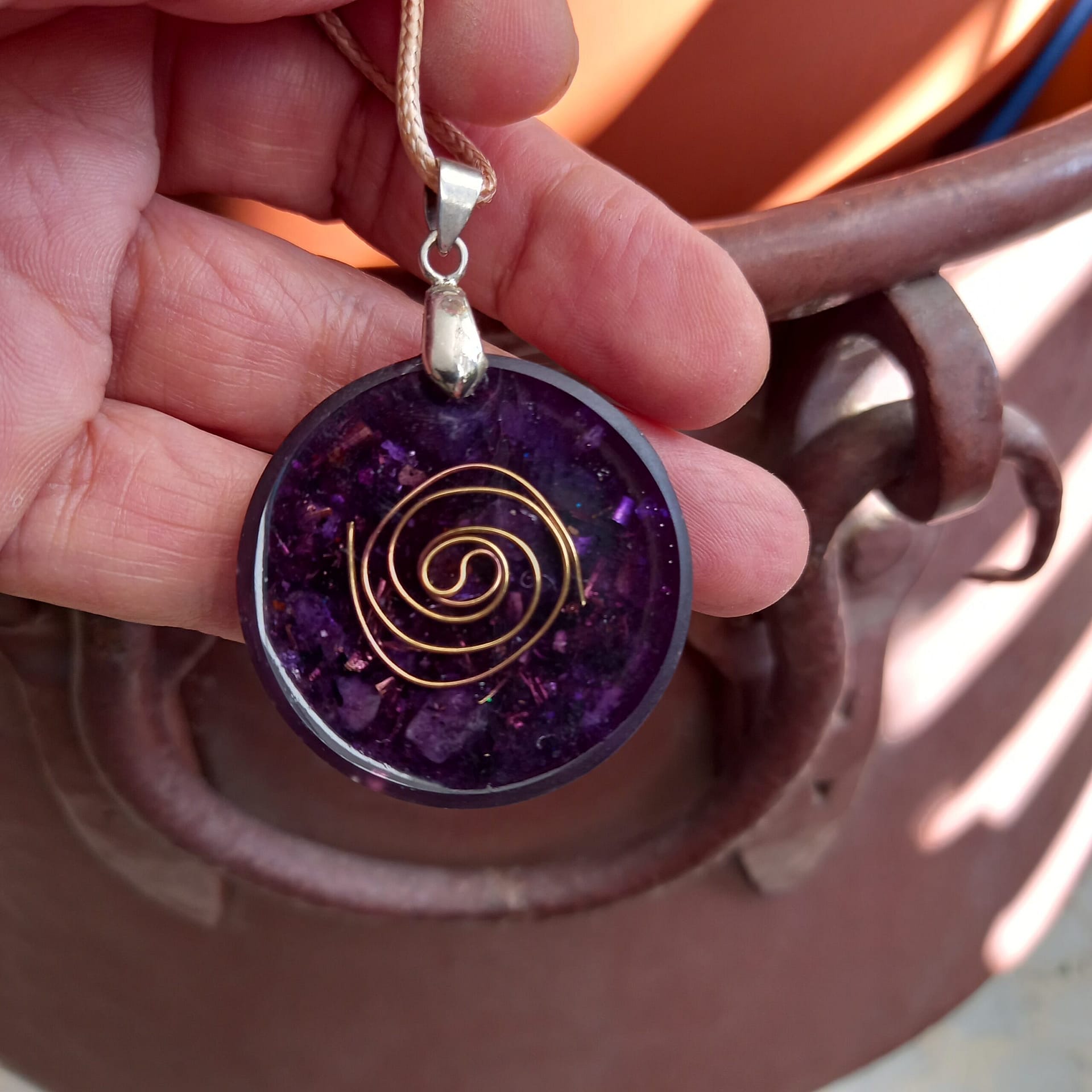 תיליון אורגונייט אנרגטי יפיפיה משובץ באבני אמטיסט סגול, קריסטל רוזקוורץ וקוורץ,קריסטל טורמלין שחורה, וארבע סוגי מתכות מעוצבת עם ספירלת נחושת לאיזון רגשי ולהגנה אנרגטית.
