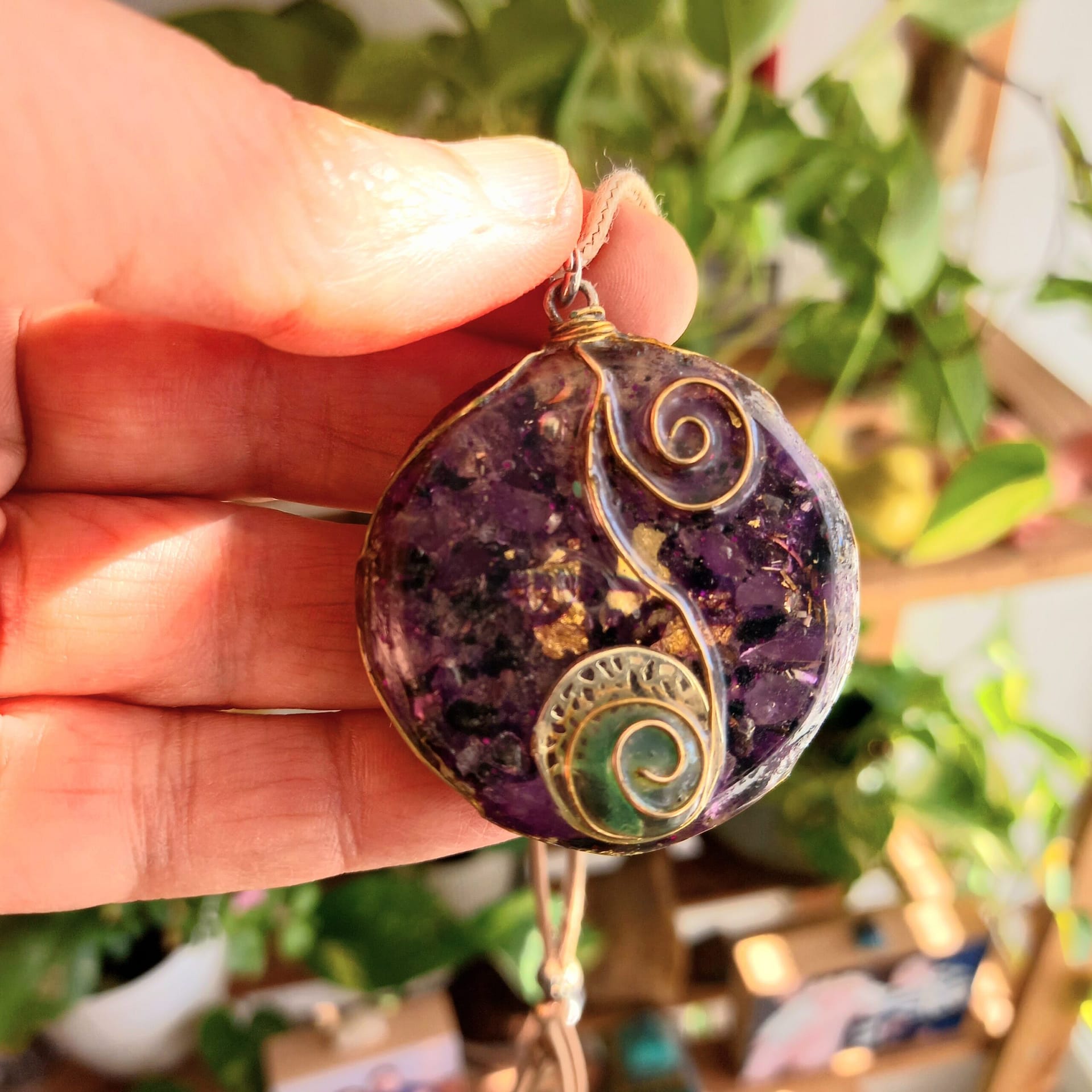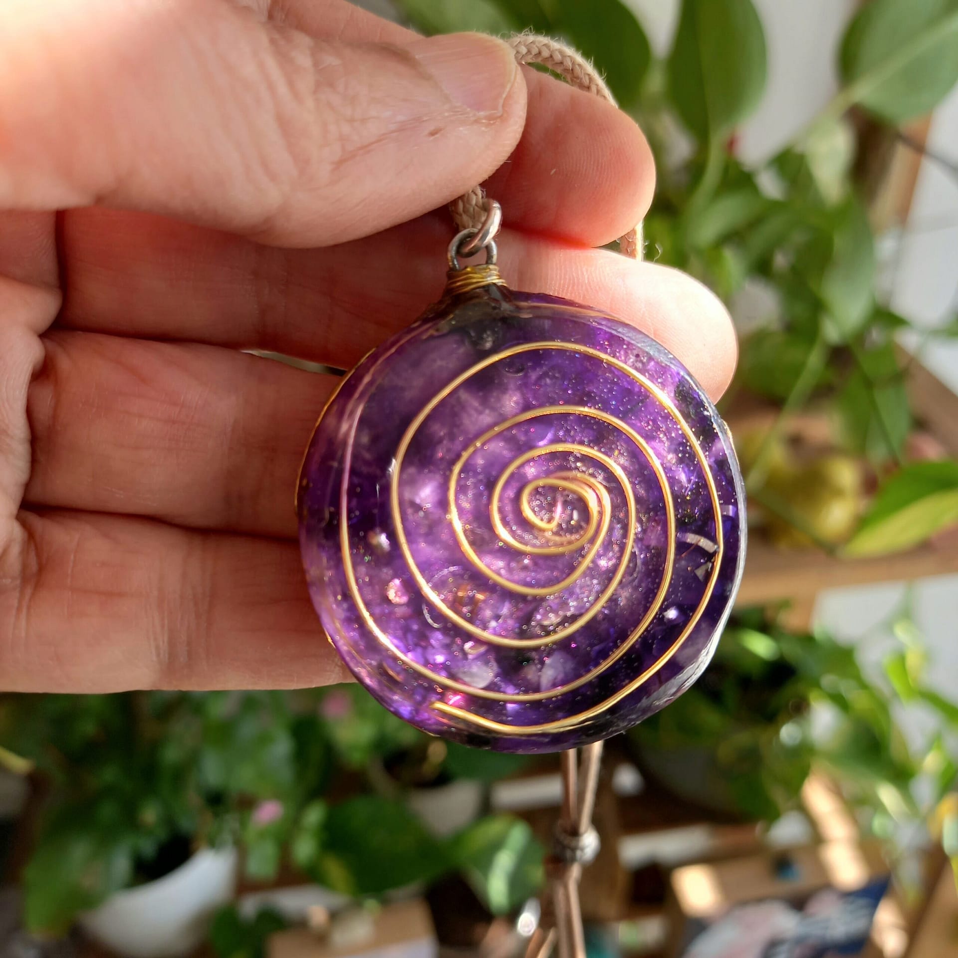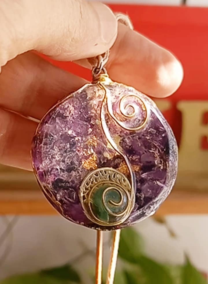 תליון אורגונייט יפיפה מעוצב עם ספירלות נחושת ואבני אמטיסט לבריאות גוף נפש ואיזון אנרגטי, תיליון תכשיט אורגונייט יוצר שמירה והגנה מאנרגיות שליליות חיצוניות ומרחיק יונים חיובים המזיקים לגופנו, כמו מחשב, טלויזיה, מיקרו גל, מוצרי חשמל כאלה ואחרים, אנטנות, ועוד.