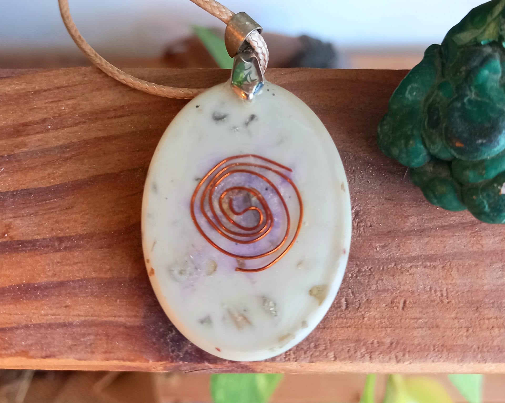 הקריסטלים בתליון: טורמליון שחורה, קוורץ, רוזקוורץ, אבקת ציפורן, קינמון ומרווה להעצמת אפקט הטיהור וההגנה, צד שני קריסטל מיקה לבנה ספירלת נחושת ומגנט נידמיום.