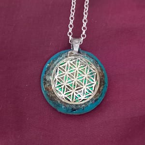 שרשרת תיליון אנרגטי אורגונייט orgonit עם פיגם (רודה/פיג'אן) צמח מרפא לשמירה והגנה מעוצב עם אבקת קריסטל מיקה ירוקה, אונטרניון, קוורץ רוזקוורץ שטובה ביעילותה להרגעה וריפוי