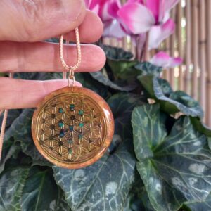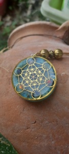 תיליון אורגונייט זרע החיים עם אבני אילת וקריסטל טורקונייט קוטר 2.5 ס"מ עובי 1.5 ס"מ אורך תיליון 55 ס"מ