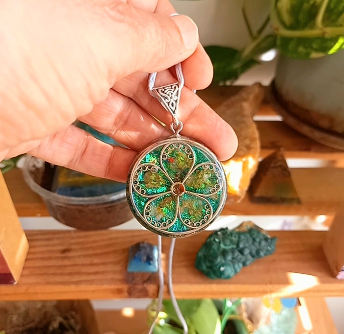 תליון אורגונייט פרח משובץ אבני פרידות וסיטרין בתוך עלי כותרת קוטר 3.5 ס"מ עובי 8" מ"מ קריסטל פרידות : שילוב של ירוק מרפא עם צהוב