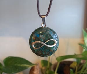 תליון אורגונייט ואבני טורמלין, קוורץ ורוז קוורץ ועפר מדורה של שירה מקודשת, אבקת ציפורן, קינמון, מרווה מור ולבונה לחיזוק שדה הגנה סביב הגוף לתגבור אנרגטי