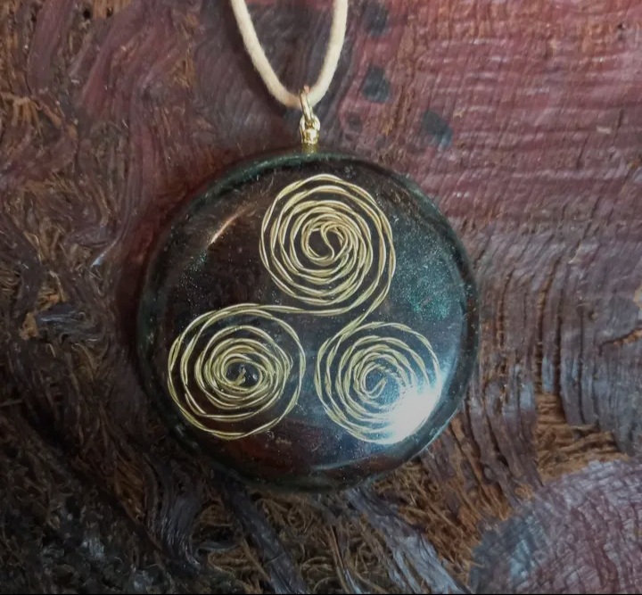 עיצוב מדהים של גיאומטריה מקודשת, טריקסליון מונח על כפות תמרים. תליון אנרגטי אורגונייט תריקסליון בעיצוב עם כפות תמרים, קריסטלים, מתכות, ספירלת נחושת ומגנט נידימיום. קינמון